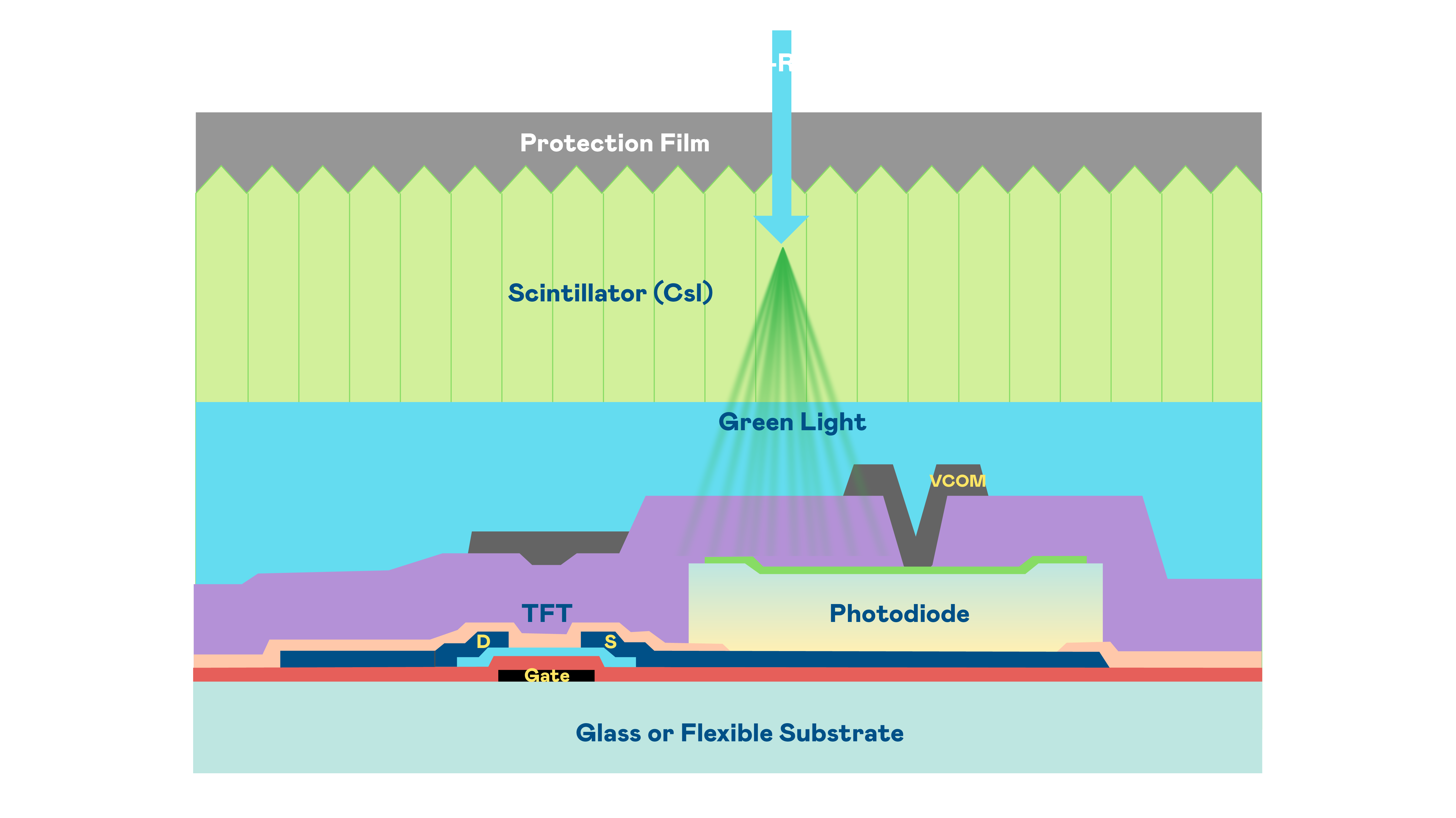 东升国际的X光影像感测阵列使用薄膜电晶体 (TFT) 作为每个像素的读取开关,搭配光电二极体(Photodiode)的光电转换元件,用以感测X光影像讯号。